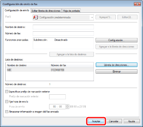 El cuadro de diálogo de los ajustes de envío del fax del controlador del fax puede variar dependiendo de su controlador de fax.