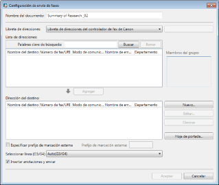 Si utiliza el cuadro de diálogo de propiedades de fax de Windows para cambiar el nombre de un fax cuando este ya se ha registrado en un botón de salida de fax, no podrá enviar por fax ese documento utilizando el botón de salida de fax.