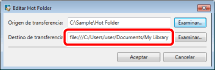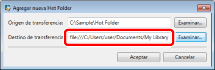 Incluso si elimina los ajustes de la Hot Folder aplicando los pasos mencionados arriba, no se borrará la Carpeta de Windows que se ha especificado como carpeta de origen.
