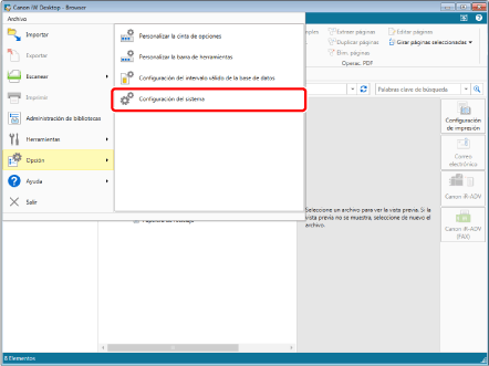 Seleccione el menú [Archivo] > [Opción] > [Configuración del sistema].