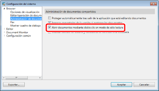 [Configuración del sistema] > [Browser] > [Administración de documentos compartidos] > [Abrir documentos mediante doble clic en modo de sólo lectura]