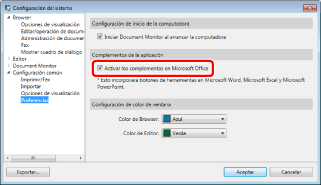 Seleccione la casilla de verificación [Activar los complementos en Microsoft Office] en [Configuración del sistema] > [Configuración común] > [Preferencias] y haga clic en [Aceptar].