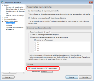 Si se selecciona la casilla [Imprimir documento PDF como imagen], todos los documentos PDF se imprimen/transmiten por fax en forma de imágenes. Anule la selección de la casilla de verificación para volverlos a imprimir/transmitir por fax como documentos PDF.