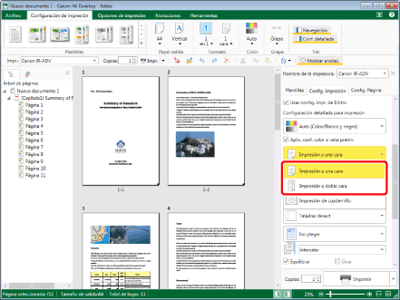 Esta función solo se puede utilizar si selecciona una impresora Canon y la casilla [Usar config. impr. de Editor] en la pestaña [Config. Impresión] de la Ventana Detalles, el comando de la cinta o el botón de herramienta.