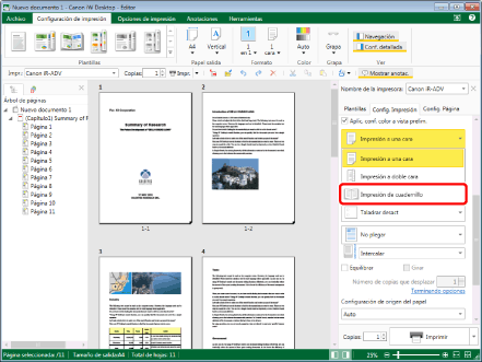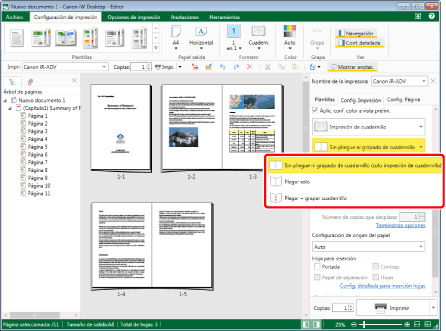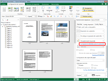 Los elementos que puede especificar en la pestaña [Config. Impresión] de la Ventana Detalles se cambian por los elementos que puede especificar para impresión de cuadernillo y se actualiza la Ventana de trabajo.