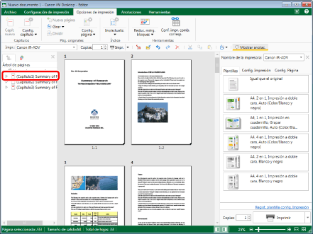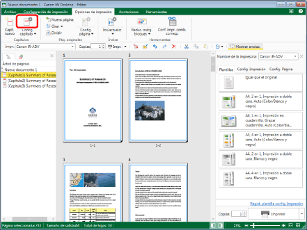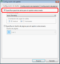 Si se ha establecido el tamaño del papel de salida en [Auto (Tamaño)] para todo el documento o para cada capítulo y no está marcada la casilla de verificación [Especificar el diseño de página para el capítulo seleccionado], si establece el diseño de página en algún valor que no sea [1 en 1] para todo el documento, el tamaño del papel de salida establecido para el capítulo pasa a ser no válido.