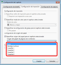 Los elementos de configuración en [Origen del papel de páginas de contenido] varían en función del origen del papel de la impresora seleccionada en [Impr.].