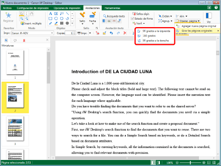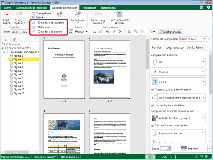 (Operac. página) en la cinta y seleccione el método de rotación en [Girar las páginas originales].