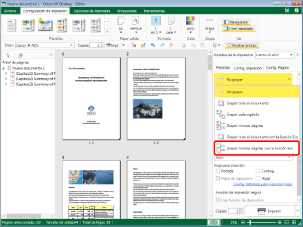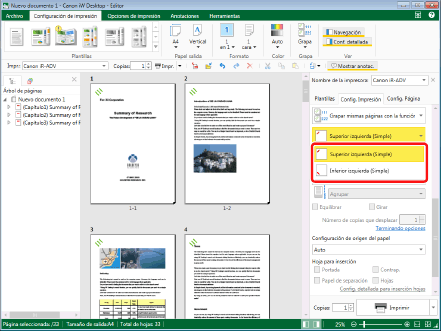 Esta función solo se puede utilizar si selecciona una impresora Canon y la casilla [Usar config. impr. de Editor] en la pestaña [Config. Impresión] de la Ventana Detalles, el comando de la cinta o el botón de herramienta.