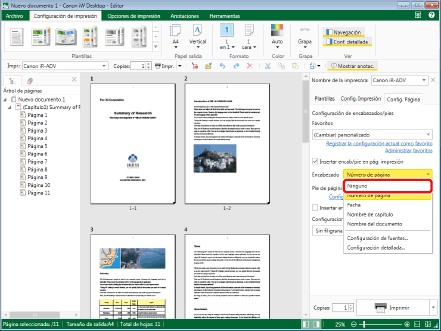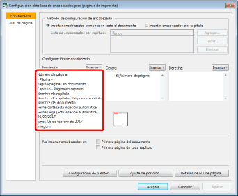 Seleccione [Configuración de fuentes] de la lista desplegable de cada [Encabezado]/[Pie de página] en [Configuración de encabezados/pies] en la pestaña [Config. Página] de la Ventana Detalles