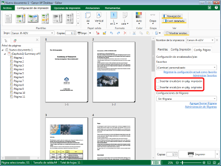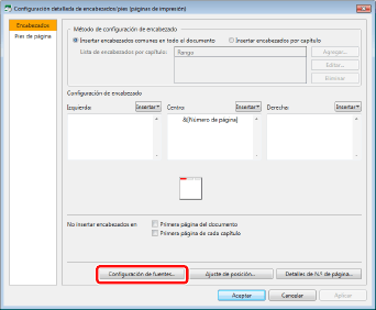 Las opciones de fuente tanto en [Insertar encab/pie en pág. impresión] como en [Insertar encab/pie en pág. originales] son iguales.