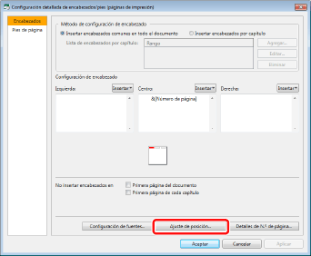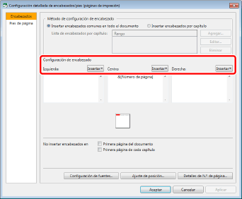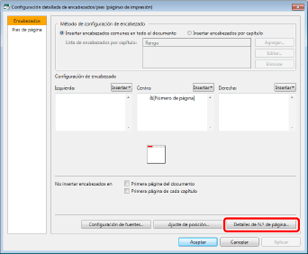 Para obtener más información sobre cómo mostrar el cuadro de diálogo [Configuración detallada de encabezados/pies (páginas de impresión)]/[Configuración detallada de encabezados/pies (páginas originales)], consulte: