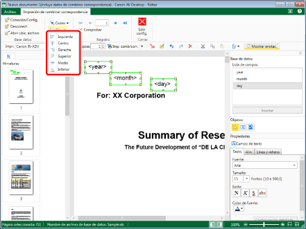 Puede alinear la posición de campos que haya insertado en el Modo de ajuste de impresión de Combinación de correspondencia de Desktop Editor.