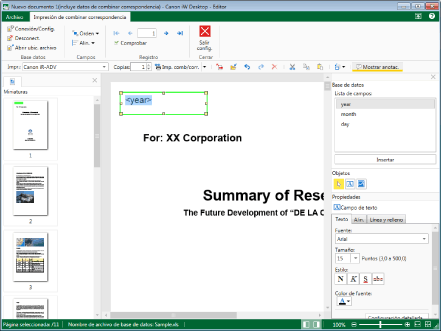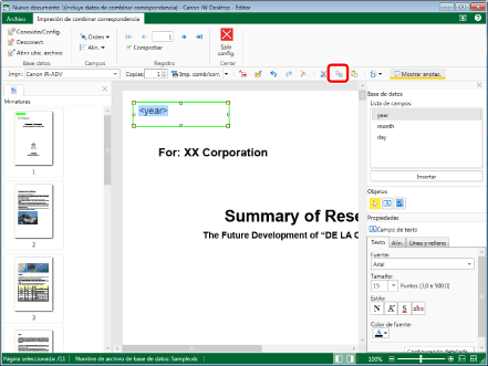Cuando se especifica otra página como destino de pegado, el campo de Combinación de correspondencia se pega en la misma posición que el origen del corte.