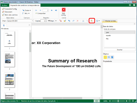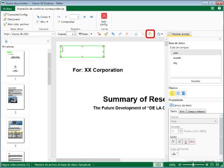 Si desea seleccionar todos los campos de Combinación de correspondencia de la página, realice una de las siguientes operaciones en un área de la Ventana de trabajo sin un campo de Combinación de correspondencia mientras mantiene activa la Ventana de trabajo.