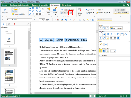Se inserta una nota en el texto y las propiedades de la nota de texto se muestran en la Ventana Detalles.
