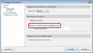 [Configuración del sistema] > [Editor] > [Anotaciones] > [Nombre de usuario]