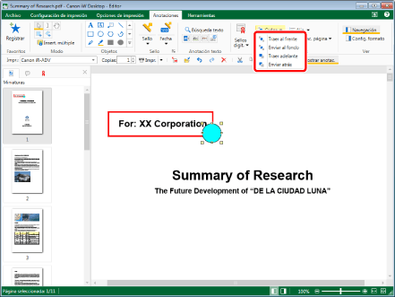 Al insertar o mover anotaciones, como sellos y texto, utilizando Desktop Editor, es posible que estas anotaciones queden superpuestas. En ese caso, puede cambiar el orden de superposición si lo necesita.