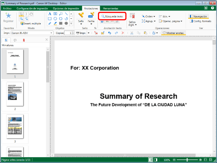 La pestaña [Miniaturas] aparece por defecto en la Ventana de navegación del Modo de anotaciones.