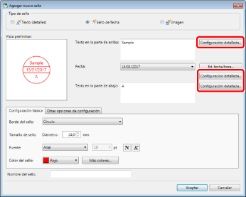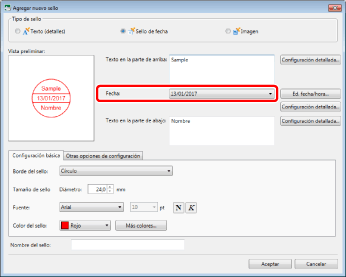 Si no introduce un nombre en [Nombre del sello], se establecerá automáticamente un nombre extraído del texto introducido en [Texto en la parte de arriba]/[Texto en la parte de abajo].
