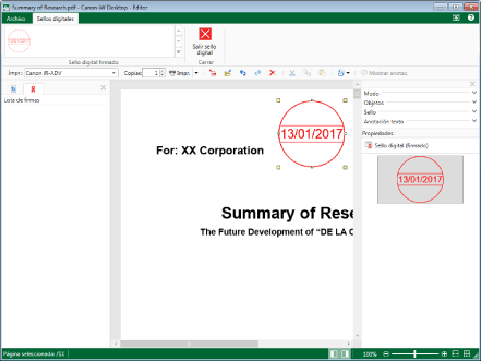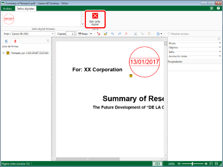 Al adjuntar un sello digital, el contenido que se muestra en la pestaña [Lista de firmas] de la Ventana de navegación se actualiza.