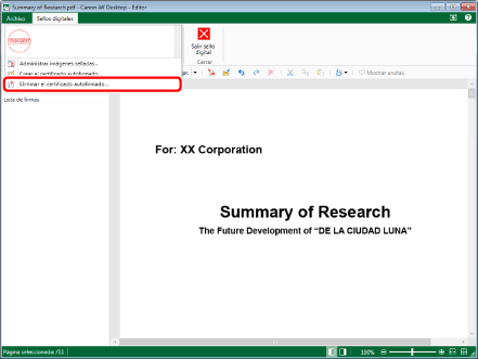 En el cuadro de diálogo [Eliminar el certificado autofirmado] solo aparecen los certificados con firma automática creados en Desktop Editor.