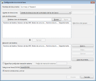 Si soltó varios documentos en [Fax] con la casilla de verificación de [Enviar por fax un archivo a la vez sin combinar múltiples archivos] seleccionada, aparece el cuadro de diálogo [Configuración de envío de faxes] para el siguiente documento. En este caso, repita los pasos 6 a 12.