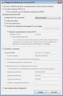 Si selecciona la casilla [Usar siempre esta configuración], el cuadro de diálogo [Configuración detallada para documento PDF] dejará de mostrarse desde la siguiente vez. Si desea que se muestre cuando suelte un archivo, seleccione la casilla de verificación [Mostrar cuadro de diálogo al [Convertir a PDF (Configuración detallada)]].