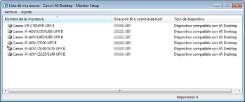 Puede establecer la monitorización de dispositivos en el cuadro de diálogo [Configuración de imageRUNNER ADVANCE Desktop Quick Printing Tool] de Quick Printing Tool y hacer clic en [Aceptar] para recuperar automáticamente la información de los dispositivos. Para obtener más información acerca del cuadro de diálogo [Configuración de imageRUNNER ADVANCE Desktop Quick Printing Tool], consulte: