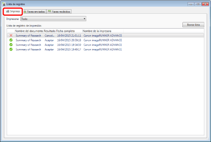 Aparece el nombre del fax cuyos registros desea ver. Solo es posible seleccionar [Todo].