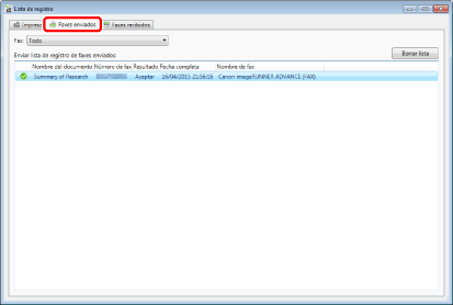 El nombre del destino, el nombre de la empresa y el departamento se muestran según el número de los faxes enviados más recientemente con [Configuración de envío de faxes] del escritorio. Puede diferir de la información mostrada en el momento en que se envío el fax.