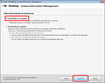 Si el ordenador desde el que desea devolver la licencia de Desktop (origen de transferencia) está conectado a Internet, devuelva la licencia en la ventana utilizando la aplicación de gestión de información de la licencia.