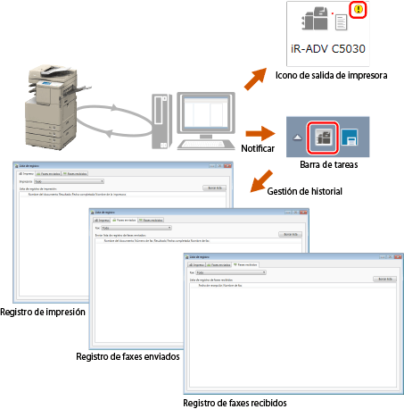 Printer Monitor le permite supervisar el estado de los trabajos de impresión y gestionar los registros de impresión y de recepción/transmisión de fax.