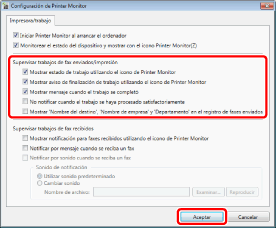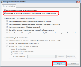 Confirme que está seleccionada la casilla de verificación [Monitorizar el estado del dispositivo y mostrar con el icono Printer Monitor] y haga clic en [Aceptar].