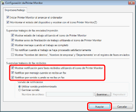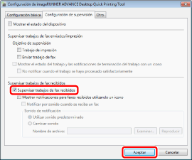 Marque la casilla de verificación [Supervisar trabajos de fax recibidos] en la pestaña [Configuración de supervisión] y haga clic en [Aceptar].