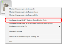 Haga clic con el botón derecho del ratón en la herramienta Quick Printing Tool en la que están registrados los dispositivos para supervisar y seleccione [Configuración de iR-ADV Desktop Quick Printing Tool].