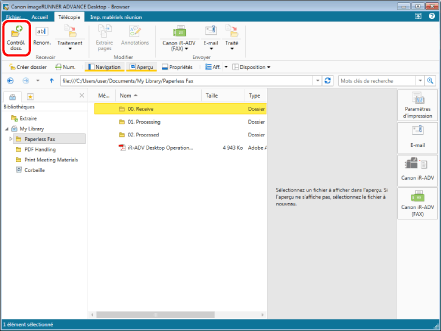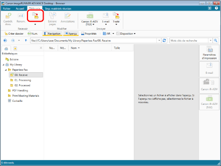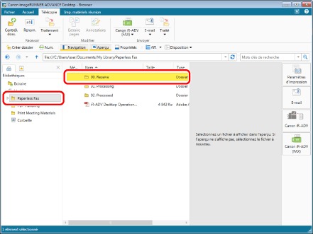 Sélectionner l'onglet [Télécopie] pour changer l'affichage du ruban. Dans l'onglet "Paperless Fax", sélectionner le dossier "00. Receive".