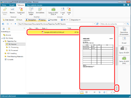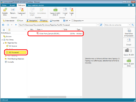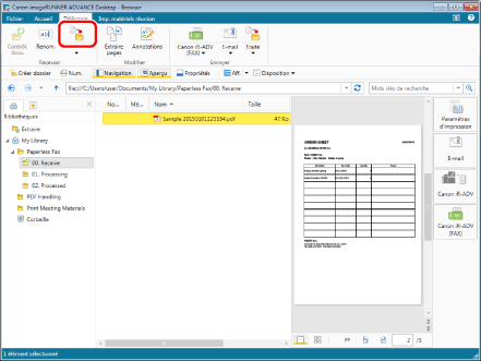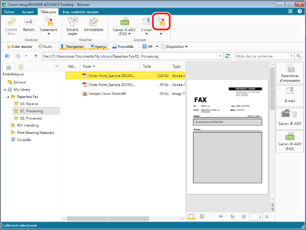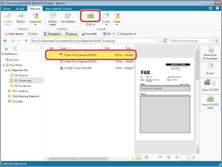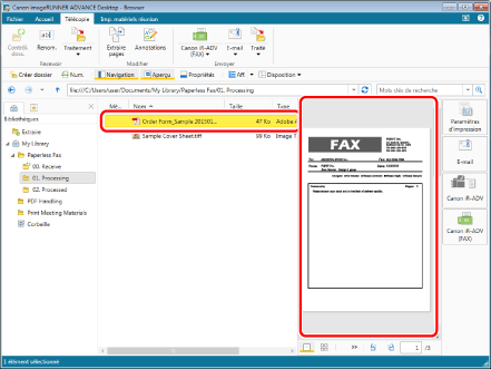 Sélectionner la télécopie envoyée dans le dossier "01. Processing" (dans cet exemple, "Order Form_Sample 20150101125534.pdf").