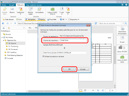 Dans la boîte de dialogue qui s'affiche, le texte saisi dans le champ [Chaînes de caractères] est ajouté au nom du document. Par exemple, entrer "Order Form" et cliquer sur [OK].