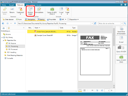 Cliquer sur [Extraire pages] dans l'onglet [Télécopie]. La page extraite est enregistrée comme un document distinct.