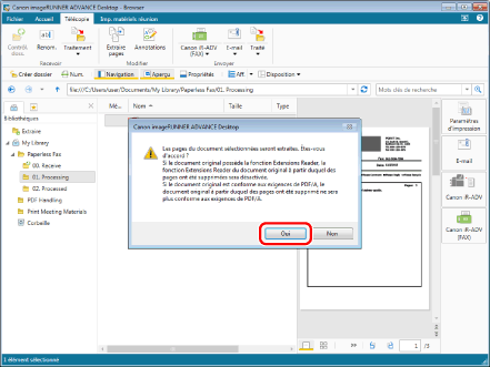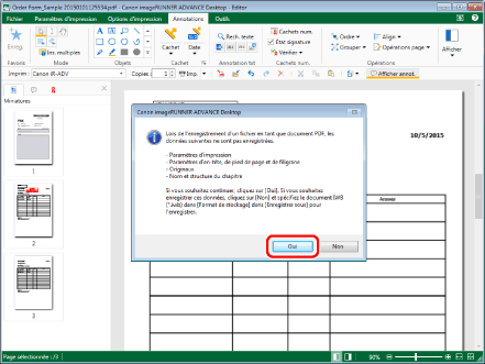 Cliquer sur [Oui]. La page extraite est enregistrée. (Dans cet exemple "Order Form_Sample 20150101125534_1.pdf".)