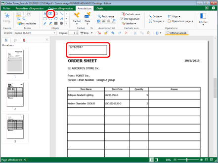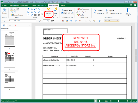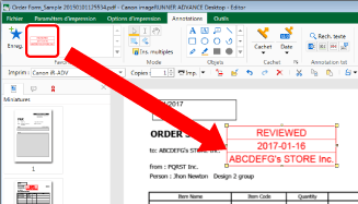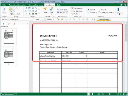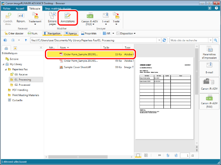 Sélectionner "Order Form_Sample 20150101125534.pdf" et cliquer sur [Annotations] dans l'onglet [Télécopie]. Desktop Editor démarre dans un autre écran.