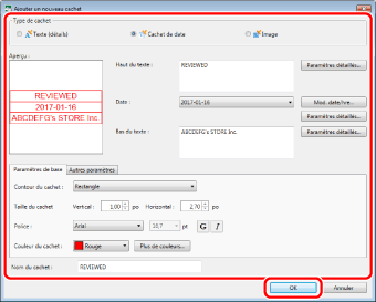 À partir de l'écran illustré ici à titre de référence, entrer le contenu du cachet. Cela fait, cliquer sur [OK], puis sur [Fermer] dans la boîte de dialogue [Gérer les cachets].