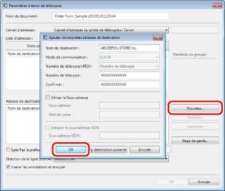 Dans la boîte de dialogue affichée, cliquer sur [Nouveau]. Dans la boîte de dialogue suivante, entrer les informations relatives au destinataire et cliquer sur [OK].