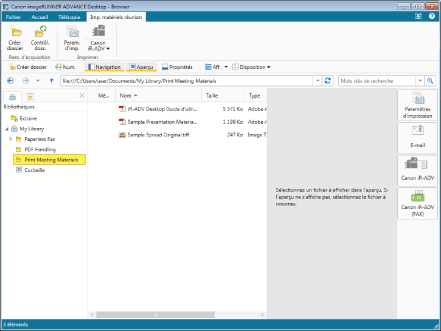 Supposons, par exemple, qu'une société organise une réunion mensuelle. Étant donné que divers documents sont nécessaires au cours de ces réunions, ils doivent être collectés et imprimés. En utilisant l'onglet [Imp. matériels réunion] enregistré lors de l'installation de Desktop, il est possible de préparer efficacement ces documents. L'onglet [Imp. matériels réunion] comprend des fonctions spécialisées pour les travaux d'impression.