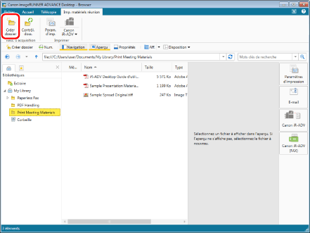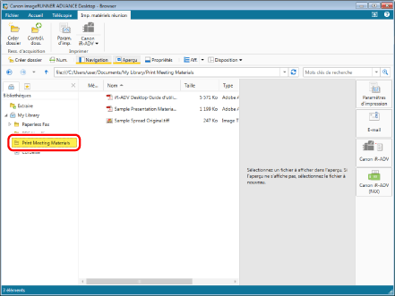Sélectionner le dossier "Print Meeting Materials", puis les documents "Sample Presentation Materials.pdf" et "Sample Spread Original.tiff" tout en maintenant la touche [Shift] enfoncée.