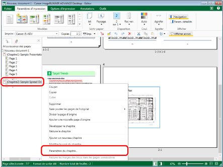 Dans l'Arborescence des pages, sélectionner "(Chapitre 2) Sample Spread Original", puis cliquer avec le bouton droit de la souris et sélectionner [Paramètres du chapitre].