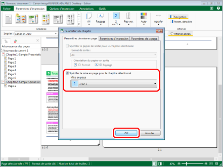 Cocher la case [Spécifier le mise en page pour le chapitre sélectionné] dans la boîte de dialogue qui s'affiche. Sélectionner ensuite [1 sur 1] dans [Mise en page] et cliquer sur [OK].