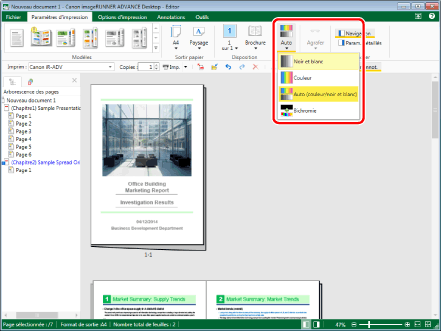 Cliquer sur [Coul.] sous l'onglet [Paramètres d'impression], et spécifier [Noir et blanc] dans la liste déroulante qui s'affiche. Les paramètres d'impression du document entier sont réglés sur noir et blanc.