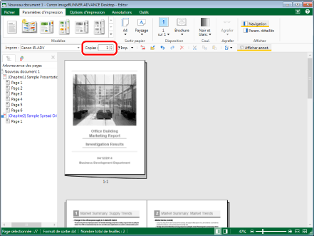 Saisir le nombre de copies à imprimer dans le champ [Copies] de la barre d'outils. Le nombre de copies peut être spécifié en entrant directement un nombre ou en cliquant sur le sélecteur
